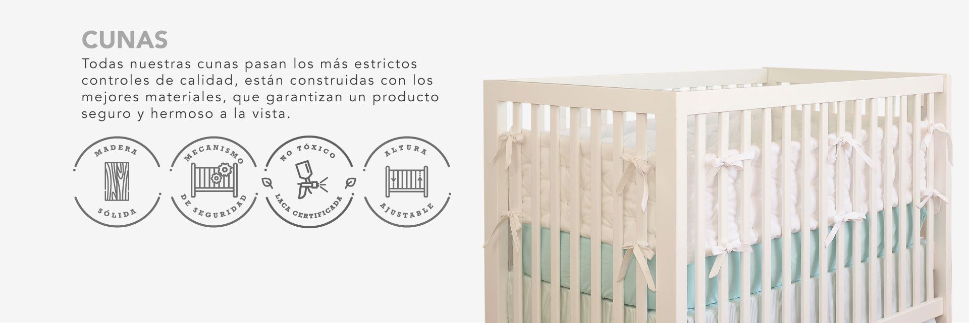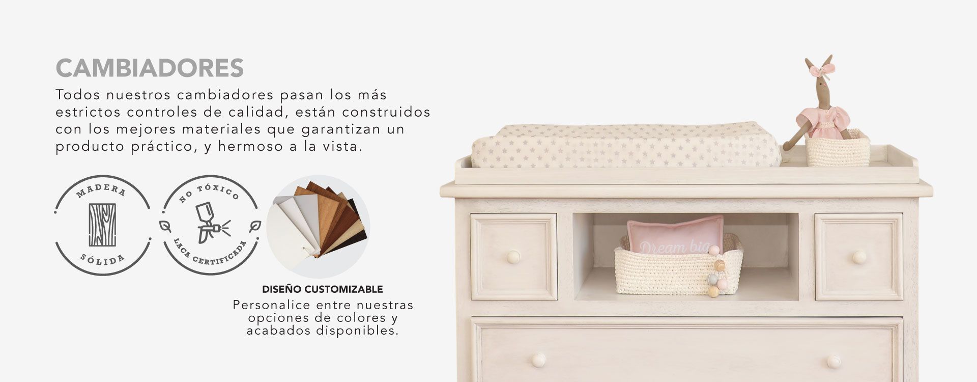 Todos nuestros muebles están elaborados con madera sólida y lacas 100% libres de plomo, lo que garantiza un producto NO TÓXICO para tus hijos.